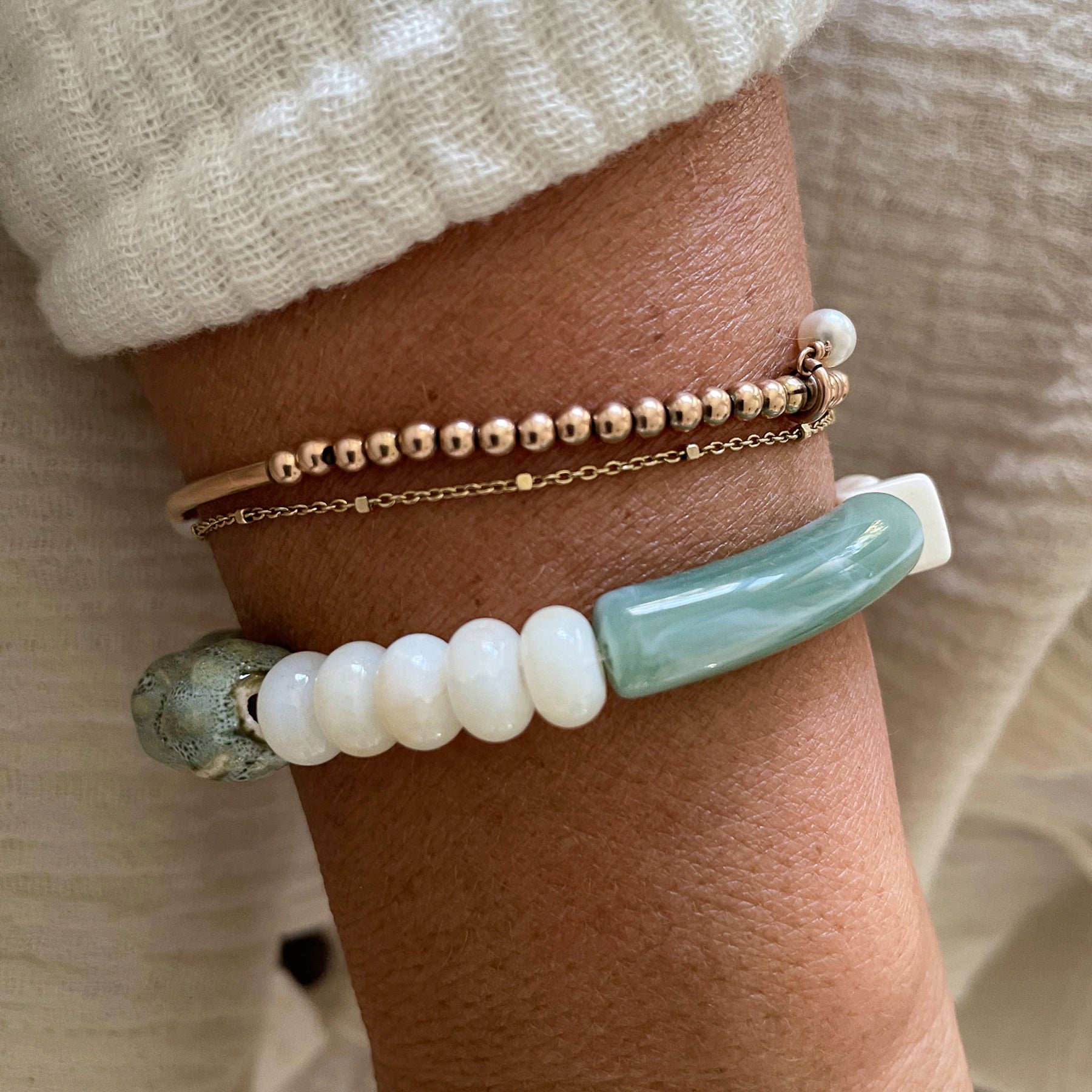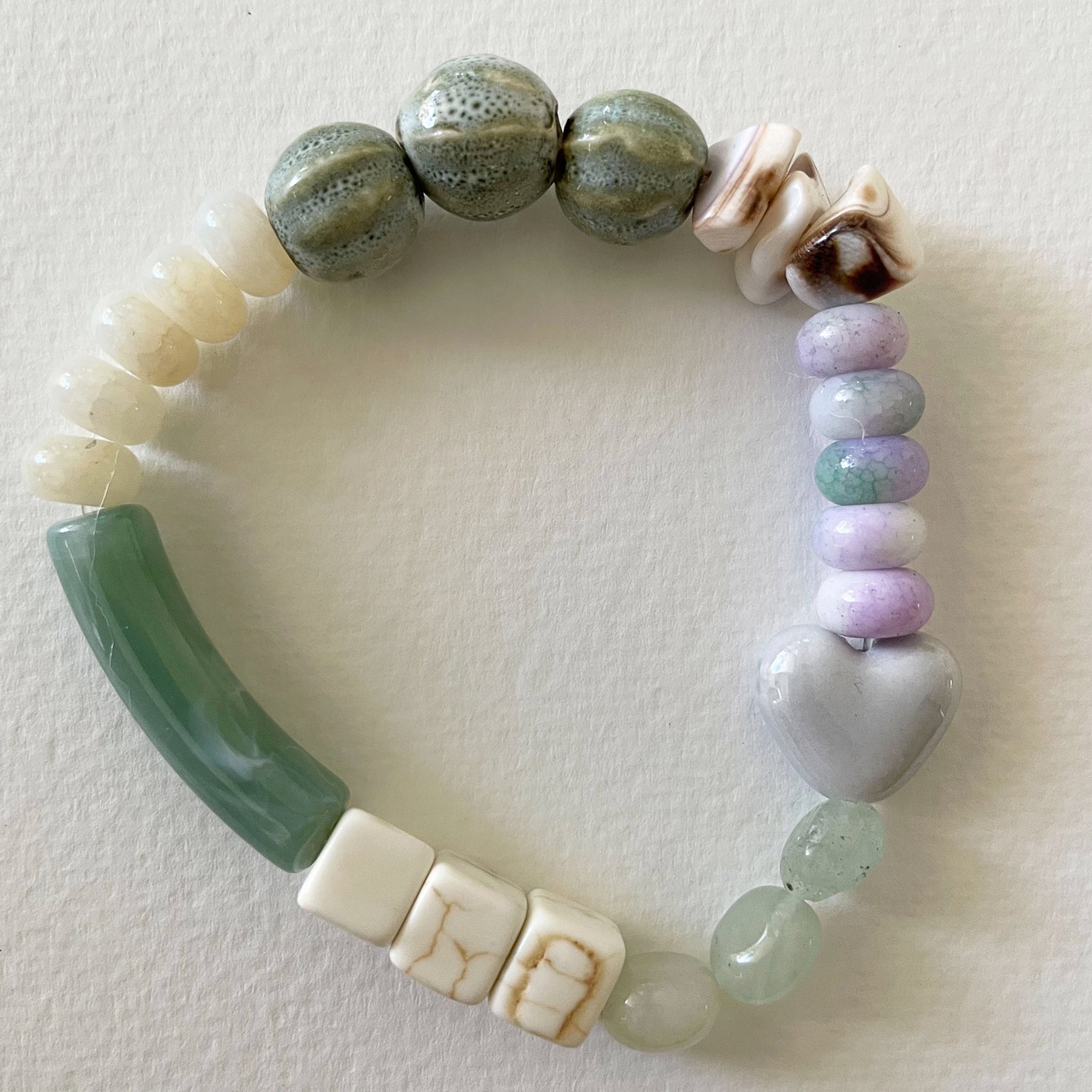 Along the opposite side, muted beads shift through lilac and soft misted tones,