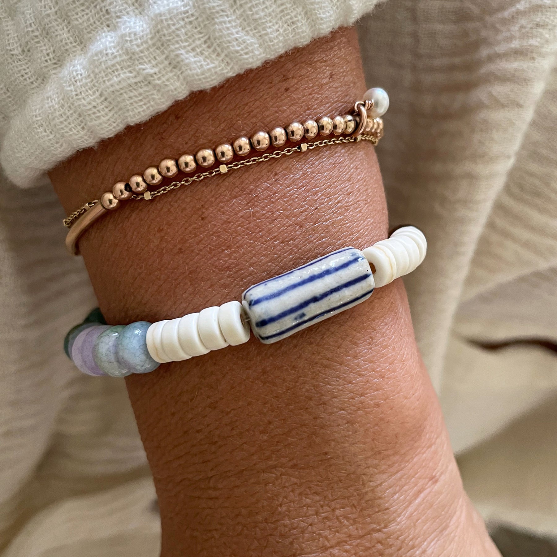 Across the bracelet, small ivory discs stack loosely,